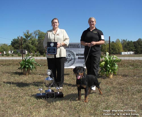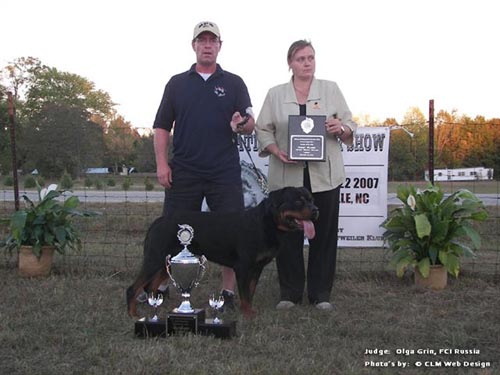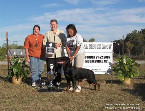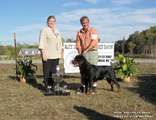 On October 20th & 21st the third annual AIRK National Sieger Show was held in Mooresville/Mt.Ulla, N.C. Hosting the event was the Mid Atlantic Rottweiler Klub. With perfect weather for both dogs and exhibitors an entry of 114 were presented to the discerning eye of Olga Grin, Koermeister, Zuchricter from Kazan, Russia. Her critiques were very thorough and thoughtful, giving the exhibitor and the audience a learning experience.