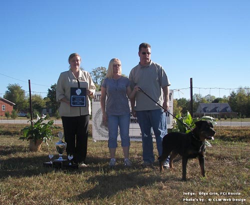 The MARK club went all out with designer trophies, a variety of food each day, a raffle and a schutzhund exhibit given by Jim Bougie from Jacksonville, N.C. with his SchH II male "Bubba". Photography was expertly handled by Richard & Christina Meacham and Kevin Rogers. The members of the club from Janice & Larry Lackey (hosts for our judge), Dwayne Martin, Ben McMillan, Barbara Johnston, Richard & Sue Shuler and of course our always efficient Mike Ellis as ring steward, handled the event like the professionals they are. Many thanks to them and to Sina Norris for her recording of the critiques.